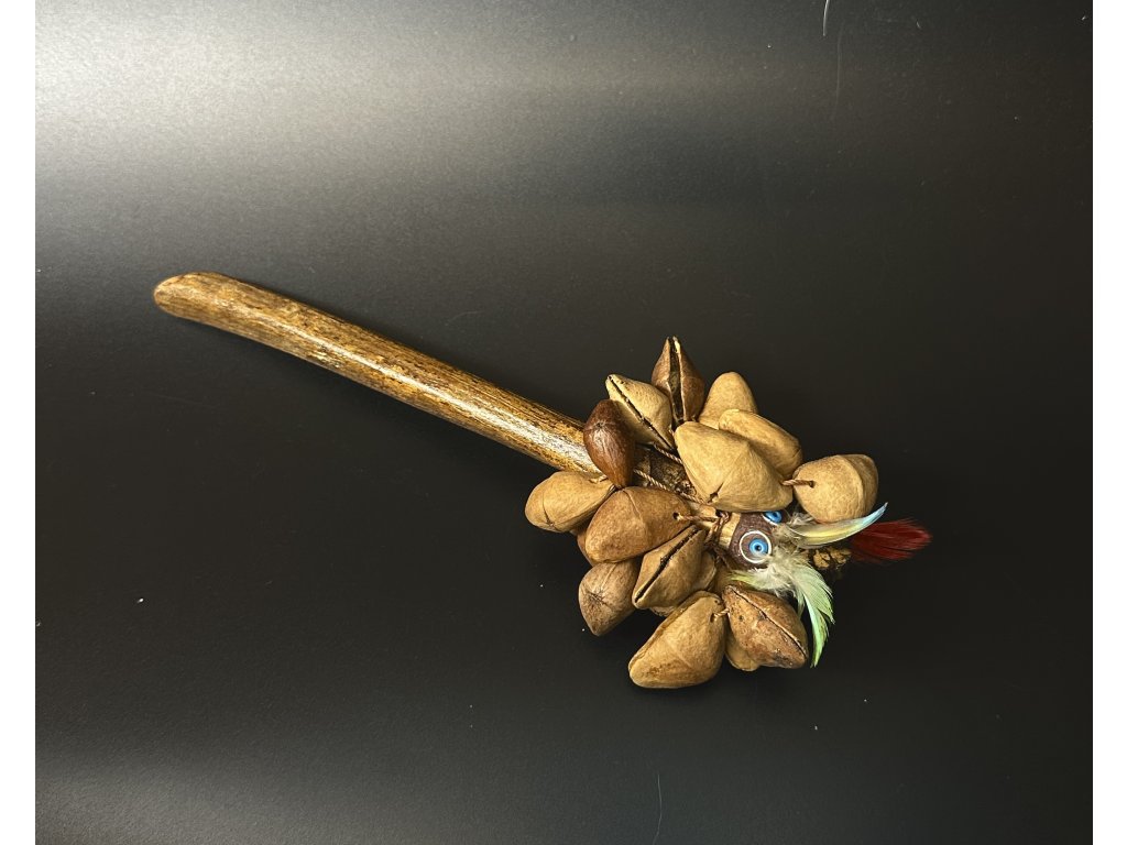 Chrastidlo s rolničkami vyrobenými ze semen Pangi ozdobené ptačími pery. Vyrobeno v Amazonii.