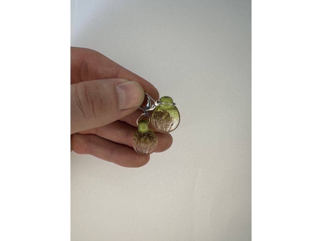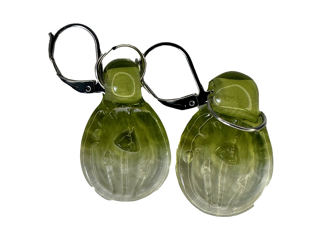 Ručně vinuté skleněné náušnice z dílny Divotvor – čiré a zelené placky s jemným přírodním motivem. Originální, lehké a plné tichého kouzla lesa.